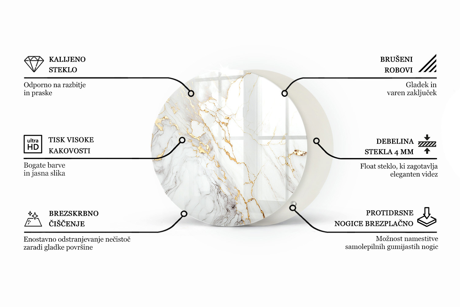 - Okrogla steklena mizna plošča z natisom Marmor z nežnimi žilami